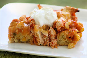 4. Bake at 400 degrees for 15 minutes. Remove from oven and pierce entire surface liberally with a fork (mixture will still be slightly gooey, this is normal); pour enchilada sauce over the top. Top with chicken; sprinkle with remaining 3/4 cup cheese. Bake at 400 degrees for 15 minutes. Remove from oven and let stand for 5 minutes.